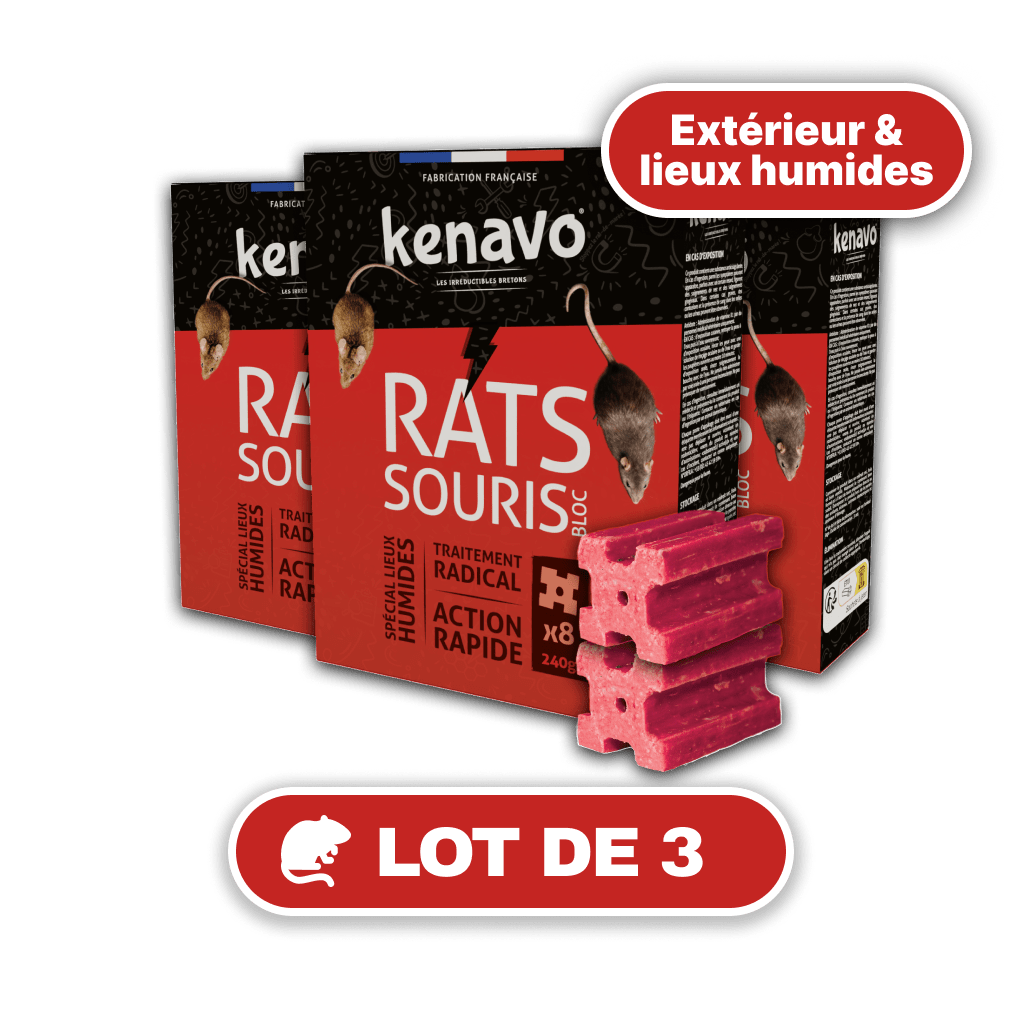 Le lot de 3 boîtes KENAVO® Appâts blocs anti rats et souris contient des appâts rodenticides solides conçus pour éliminer efficacement les rats et les souris dans les habitations et leurs abords.