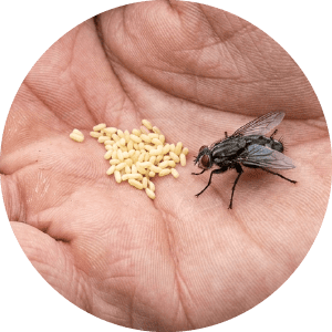 Les mouches pondent là où leurs larves auront de quoi se nourrir. Cela peut être des déchets, des matières organiques en décomposition, certaines poubelles, du compost, des résidus humides, des excréments ou des environnements similaires. Les œufs éclosent vite, parfois en moins d’une journée dans de très bonnes conditions. Une éclosion de larves peut arriver en 8 à 20 heures.