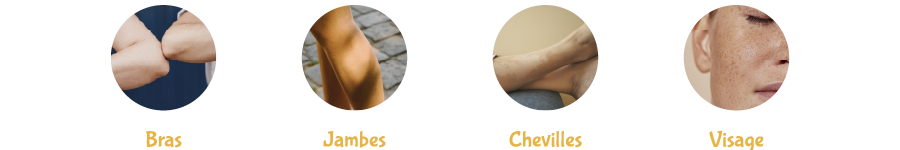 | Zones | Parties découvertes | Bras, dos, jambes | Chevilles, jambes |